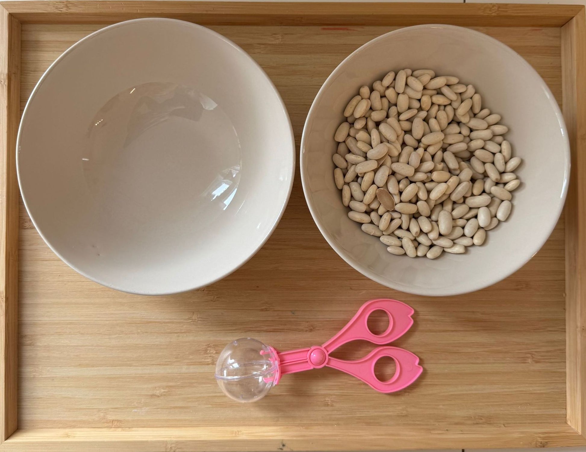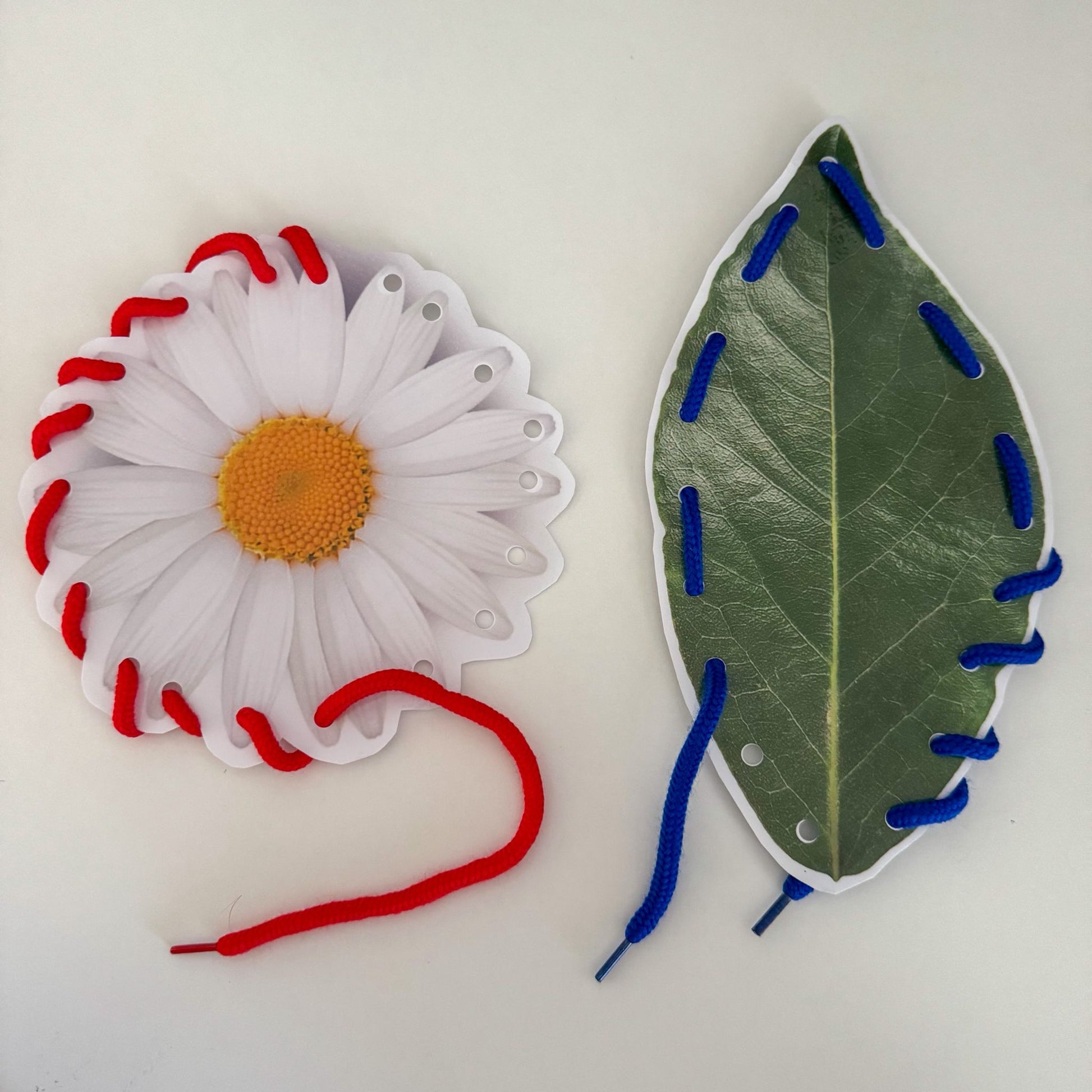 5. Vie pratique : Une activité d'enfilage avec deux cartes et des fils pour améliorer la concentration, et une activité de transvasement pour renforcer la motricité fine.
