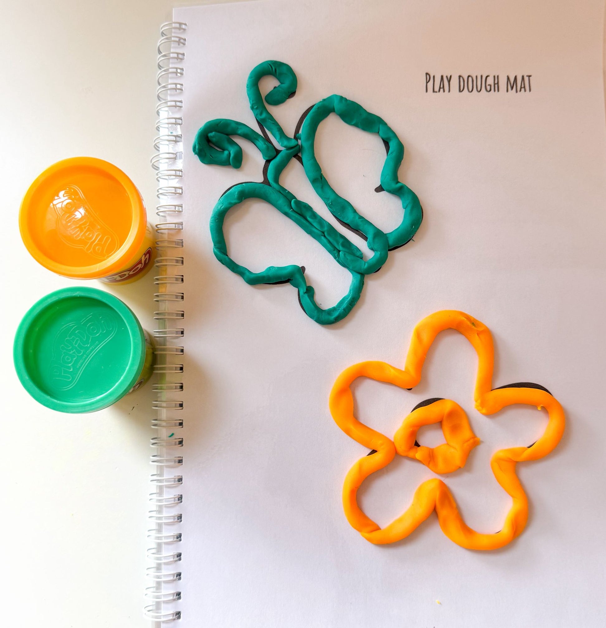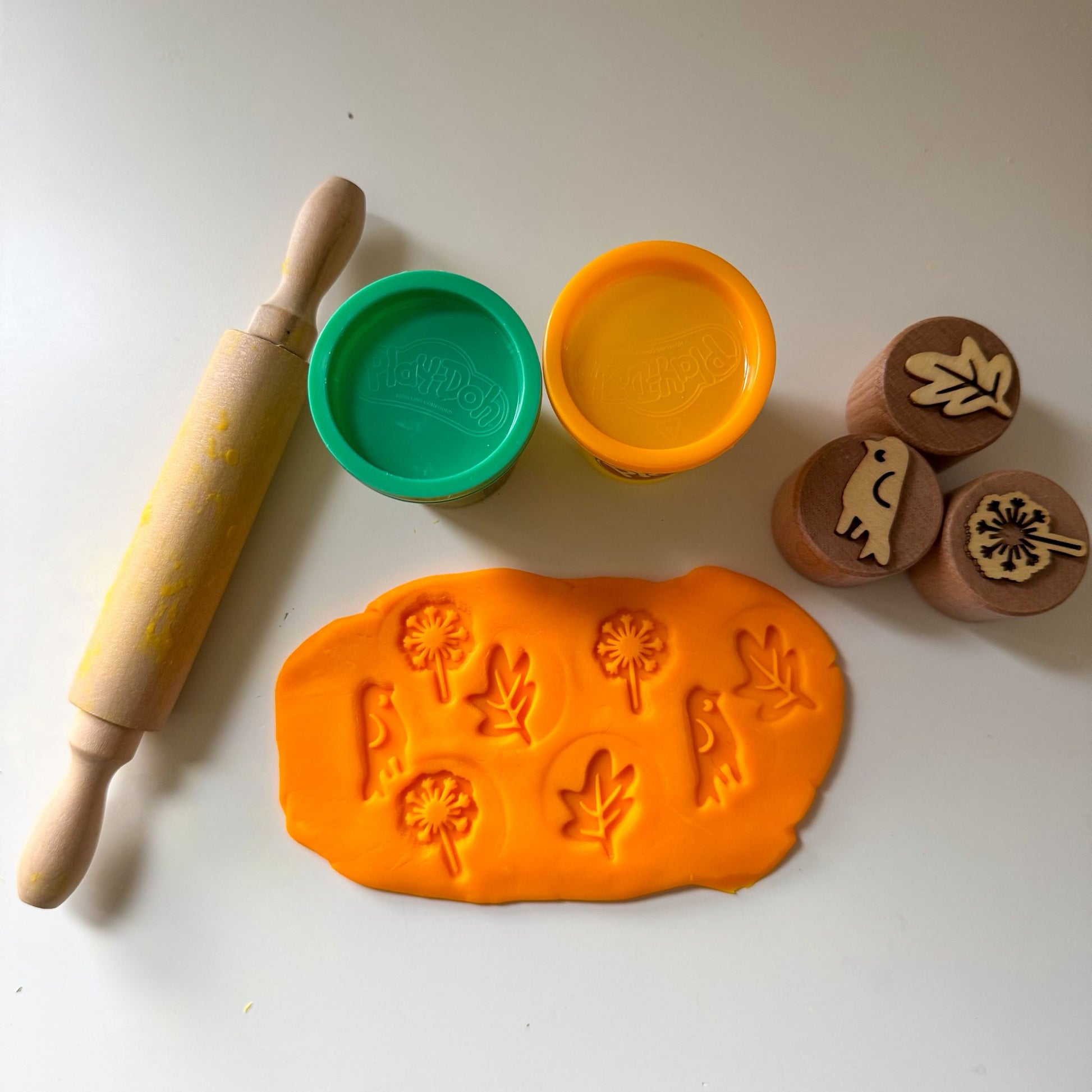 6. Motricité fine : Un ensemble de jeu de pâte à modeler avec deux pots de pâte, un rouleau en bois, des tampons sur le thème du printemps et deux tapis de jeu.