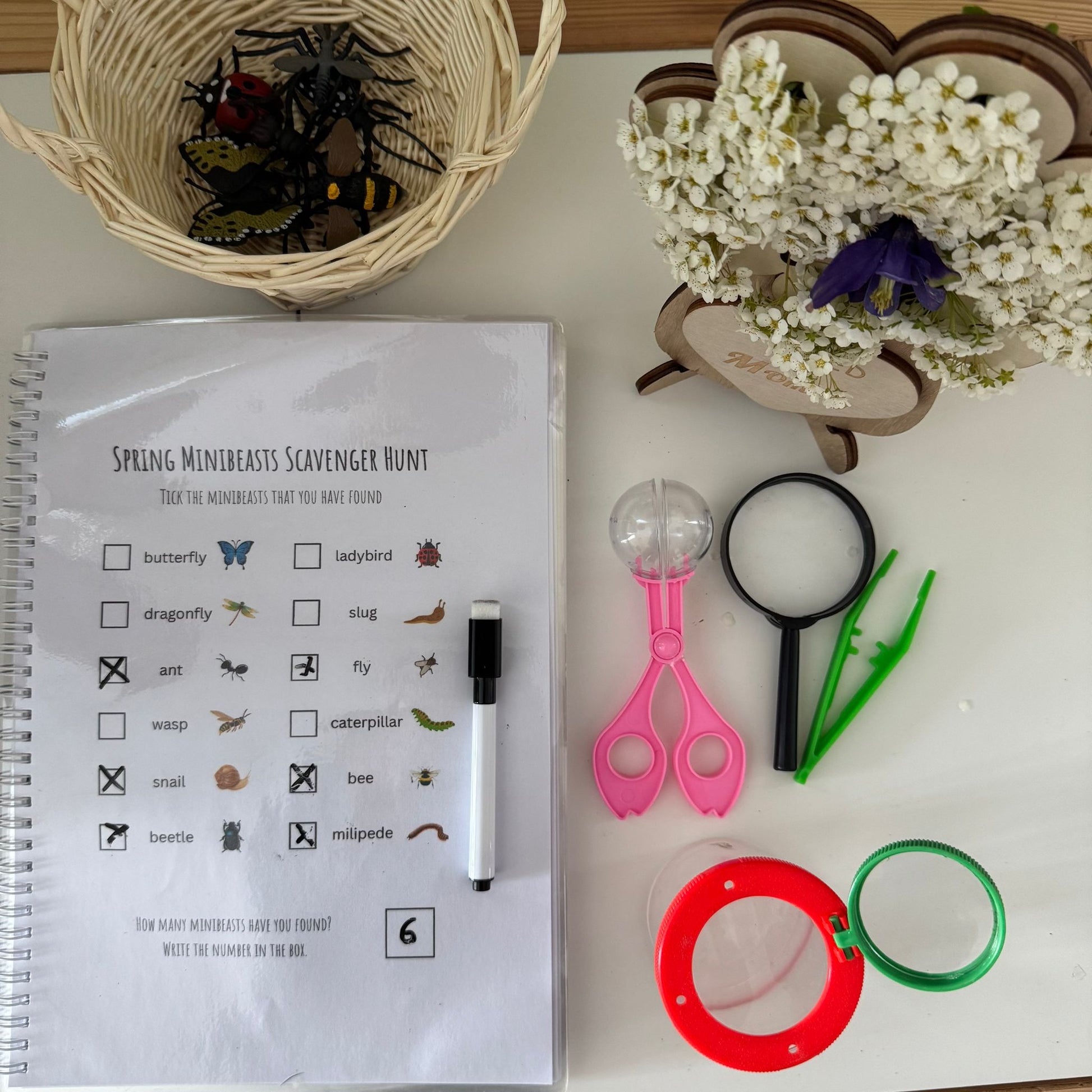 1. Maths & Logique : Un livre d'activités avec plus de 20 activités sur le thème du printemps (dénombrement, puzzles, formes, couleurs, logique, écriture), ainsi que des stylos effaçables, une loupe et 10 cartes de comptage réutilisables sur le thème du printemps.