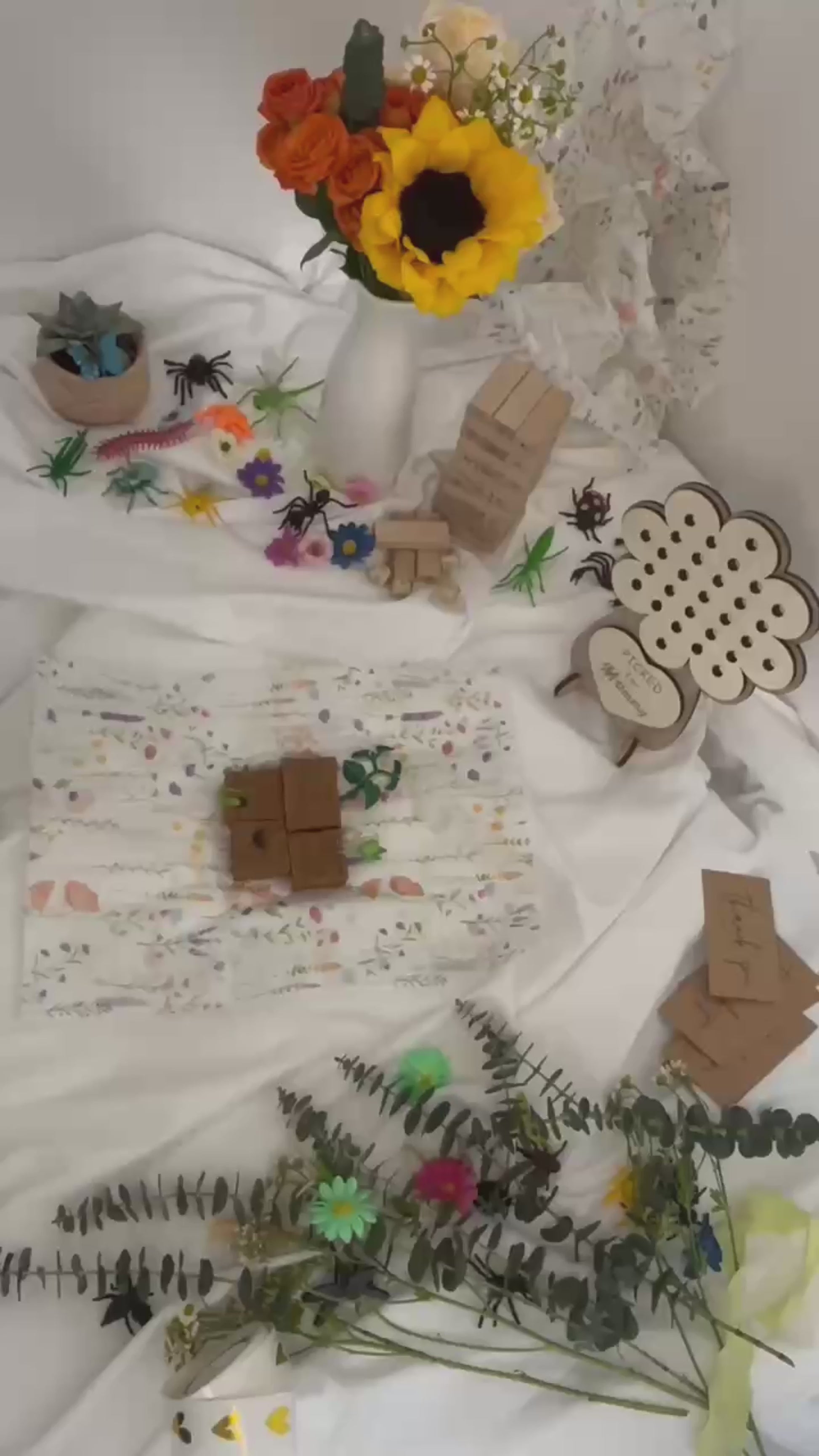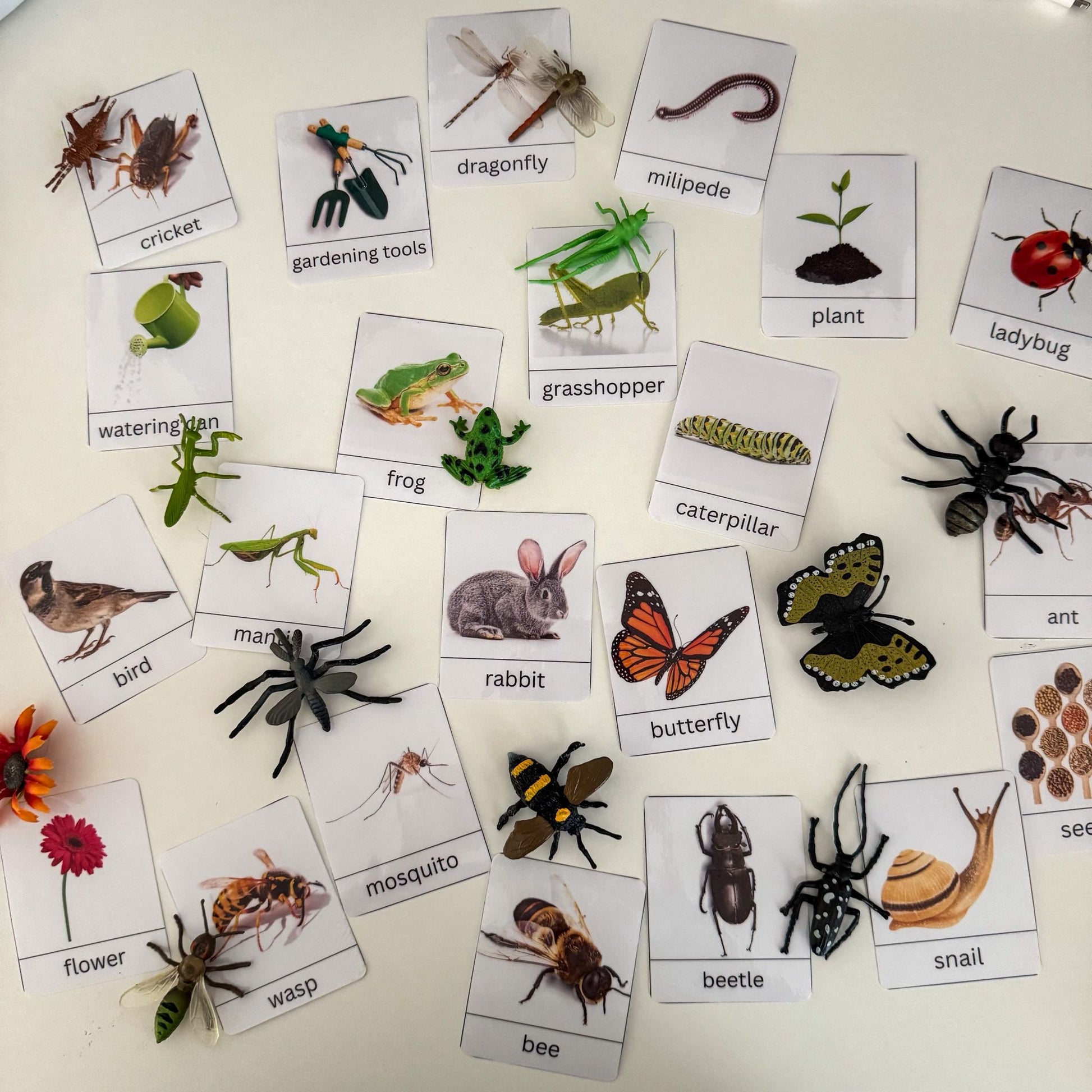 2. Langage : 22 cartes de vocabulaire avec de véritables illustrations de printemps, associées à des figurines d'insectes réalistes pour enseigner à votre enfant les créatures de la saison.